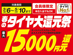 キャンペーン一覧 ホーム キャンペーン一覧 当店で実施予定のキャンペーン 2026年 春のタイヤ大還元祭 – オートバックスはタイヤが安い!サイズに応じて最大15,000円還元 3月6日(金)から5月10日(日)まで実施 購入サイズに応じて最大15,000円還元!2026年春&ゴールデ 2026年春 ドライブレコーダー・電子ミラー大還元祭 – オートバックスなら対象機種購入で最大10,000円還元! 2月20日(金)から5月10日(日)まで実施 対象機種購入で最大1万円還元!春&ゴールデンウィークのドライブ 2026年春 カーナビ大還元祭 – オートバックスならカーナビの購入金額に応じて最大7万円還元! 2月20日(金)から5月10日(日)まで実施 購入金額に応じて最大7万円還元!春&ゴールデンウィークのドライ PayPayポイントが最大5%戻ってくる! – 2026年2月・3月 PayPayアプリでクーポンを獲得してオートバックスでお得にお買い物 2月1日(日)から3月31日(火)まで実施 オートバックスで実施!PayPayアプリで事前にクーポンを獲得し Vポイント クーポン祭り – まずはエントリー!オートバックスでお買物時にモバイルVカード提示でポイント2倍 2月1日(日)から3月31日(火)まで実施 オートバックスで税抜300円以上お買物時にモバイルVカード提示で クルマを買っていただいた方に最大10万円分のギフトカードプレゼント – 2026年2月・3月 オートバックスでのクルマ購入がお得! 2月1日(日)から3月31日(火)まで実施 愛車を買うなら今がお得!オートバックスでクルマを買っていただいた 2025年-2026年 オートバックスヒートアップキャンペーン – Tune&Dress up スポーツパーツが安い! 2026年3月31日(火)まで実施中 2026年3月31日(火)までメーカー希望小売価格から最大45%OFF