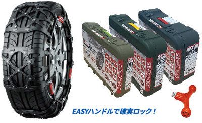 降雪時の寒い場所で、素早く、ラクに、確実に装着可能。軽くて扱いやすい画期的な布製タイヤチェーン。