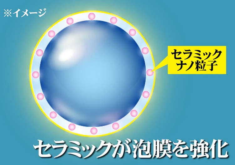 • セラミックナノ粒子が泡膜を強化し、割れにくい泡を形成します。
