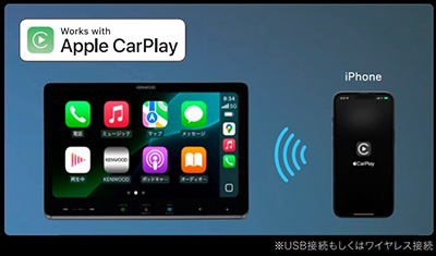 ワイヤレス接続でiPhoneのスマホアプリをナビの大画面で使える!Apple Musicや電話/メッセージ/マップなど普段使っているiPhoneアプリをナビで利用できます。しかもワイヤレス対応なので配線不要。Siriを使ってマイクに話しかけることで、前を向いたまま目的地設定や好きな音楽を選曲して聴いたり、かけたい相手に電話もできます。USBケーブルによる有線接続にも対応しています。